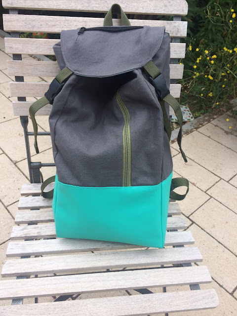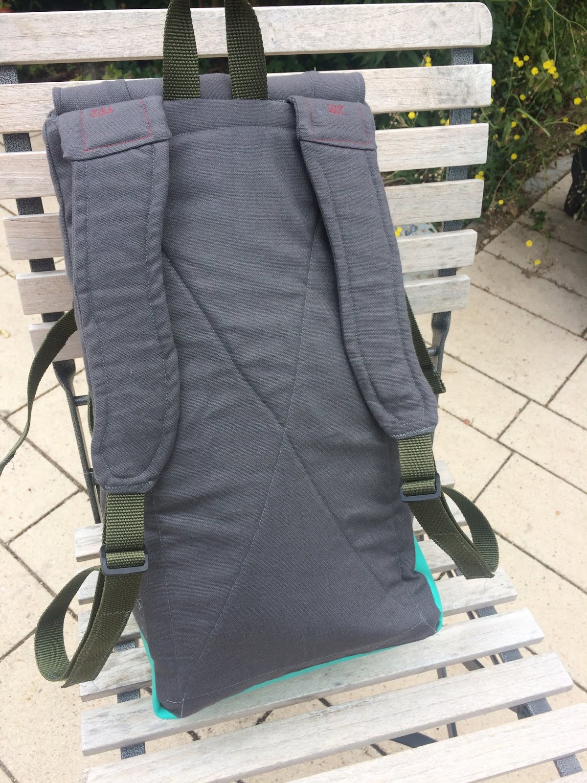 Alles in allem ein schicker Rucksack und ein schöner Schnitt. Die Teilung mit dem hochgezogenen Boden lässt nette Stoff- und Musterkombinationen zu. Ich würde im Zweifelsfall die Aussenstoffe auch noch verstärken. Die Anleitung sieht Polster am Rücken, am Boden und an den Trägern vor. Eher weiche Stoffe könnten aber noch mehr Verstärkung über die volle Fläche brauchen. Hier hatten wir den Vorteil des supersteifen Futters das für den nötigen Stand sorgt. Ansonsten finde ich den Canvas eher als dünn und das Snaply-Kunstleder ist auch ziemlich weich, da hätte ich noch Vlieseline H640 oder sowas draufgepappt. Sind aber beides sehr schöne Materiale und die Farbauswahl bei Snaply ist grandios.