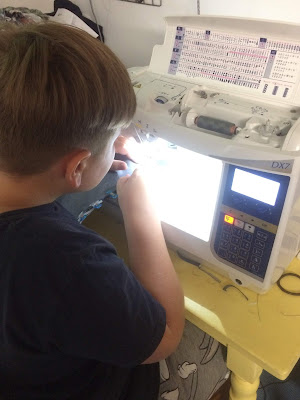 Das Nähen hat gut geklappt und Julius hat wirklich bis auf wenige Nähte alles selbst genäht. Zugegeben, den Zuschnitt wollte ich lieber selbst machen und natürlich habe ich immer gesagt wo er nähen soll usw, aber mit der Nähmaschine kommt er wirklich gut klar, auch Einfädeln durfte ich nicht, dank der aufgedruckten Fadenwege macht das ja sogar Spaß. Und ab und an hat er auch den Nahttrenner bedient. Um die Motivation nicht zu bremsen, habe ich das auch mal übernommen...