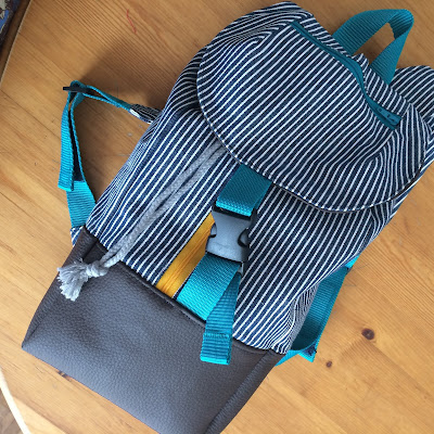 Ganz zum Schluss, wenn man dann quasi schon den ganzen Rucksack unter die Nähmaschine zwängen muss, da hat er dann doch kapituliert und mich gebeten weiter zu machen, aber das war dann auch ok, find ich selber ätzend... Als Futter hatte er sich relativ dickes Kunstleder ausgesucht, das war ein Gewurschtel und Geschiebe...!