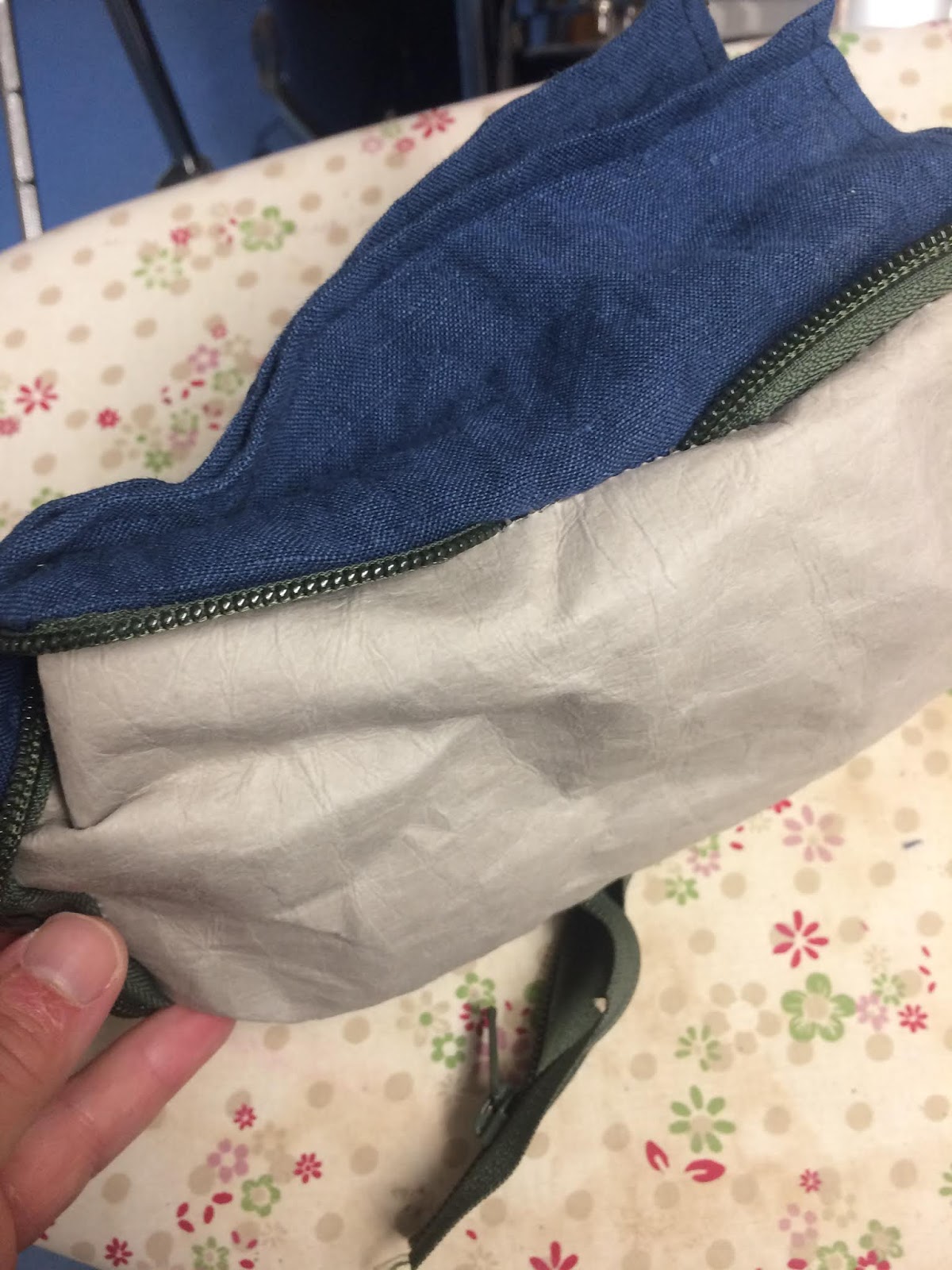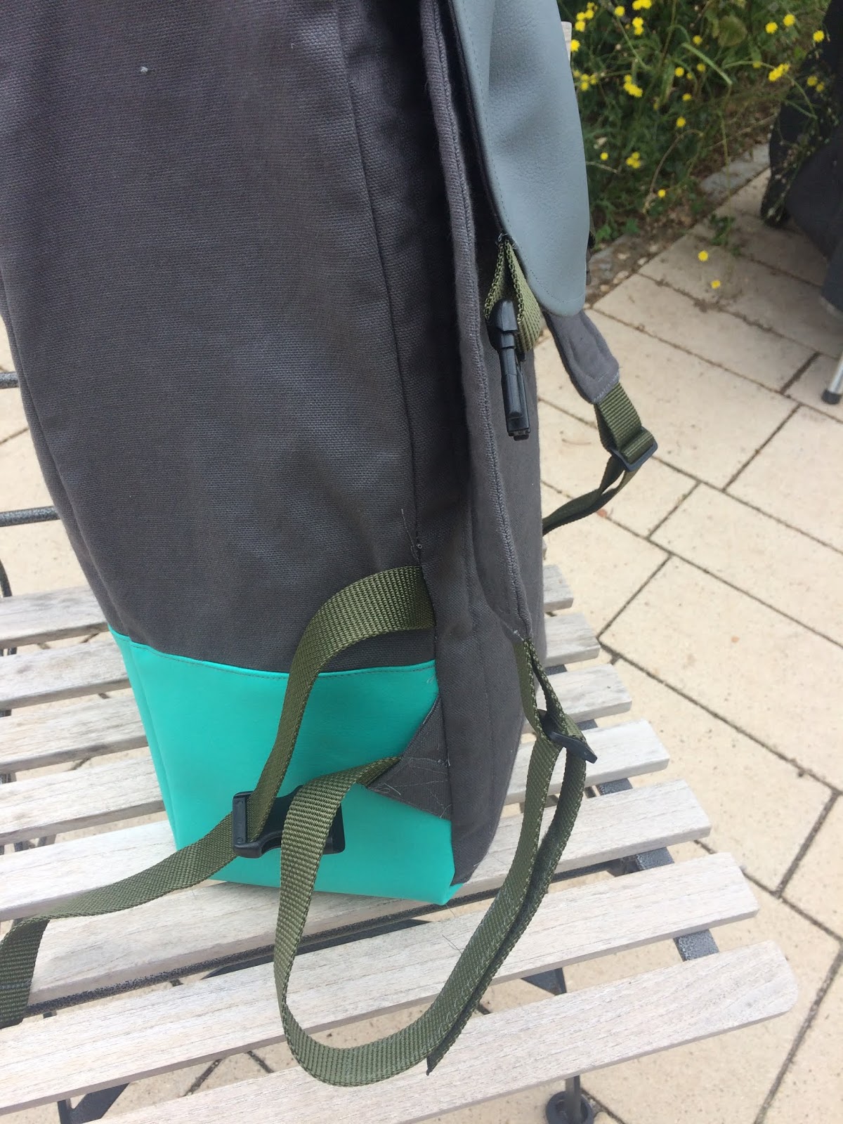 Nach dem Schnittmuster ging es ans Material aussuchen, oben dunkelgrau und unten sollte es Kunstleder in helltürkis sein. Krasse Kombi, aber Bitteschön. Ich hatte Schwarze Gurte und Schnallen gekauft, aber es gab noch olivgrünes Gurtband im Vorrat, das hat ihm besser gefallen und hat auch gereicht. Für die vordere Tasche haben wir dann noch einen olivfarbenen RV besorgt und den sichtbar eingenäht. Oben in der Klappe ist ein schwarzer.