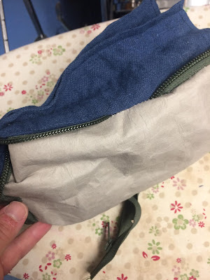 Oberhalb des Reissverschlusses geht die Tasche noch reichlich hoch, 17cm sind es da bis zum Kordelzug, das haben wir halbiert und das Stück Aussenstoff einfach umgeklappt.
